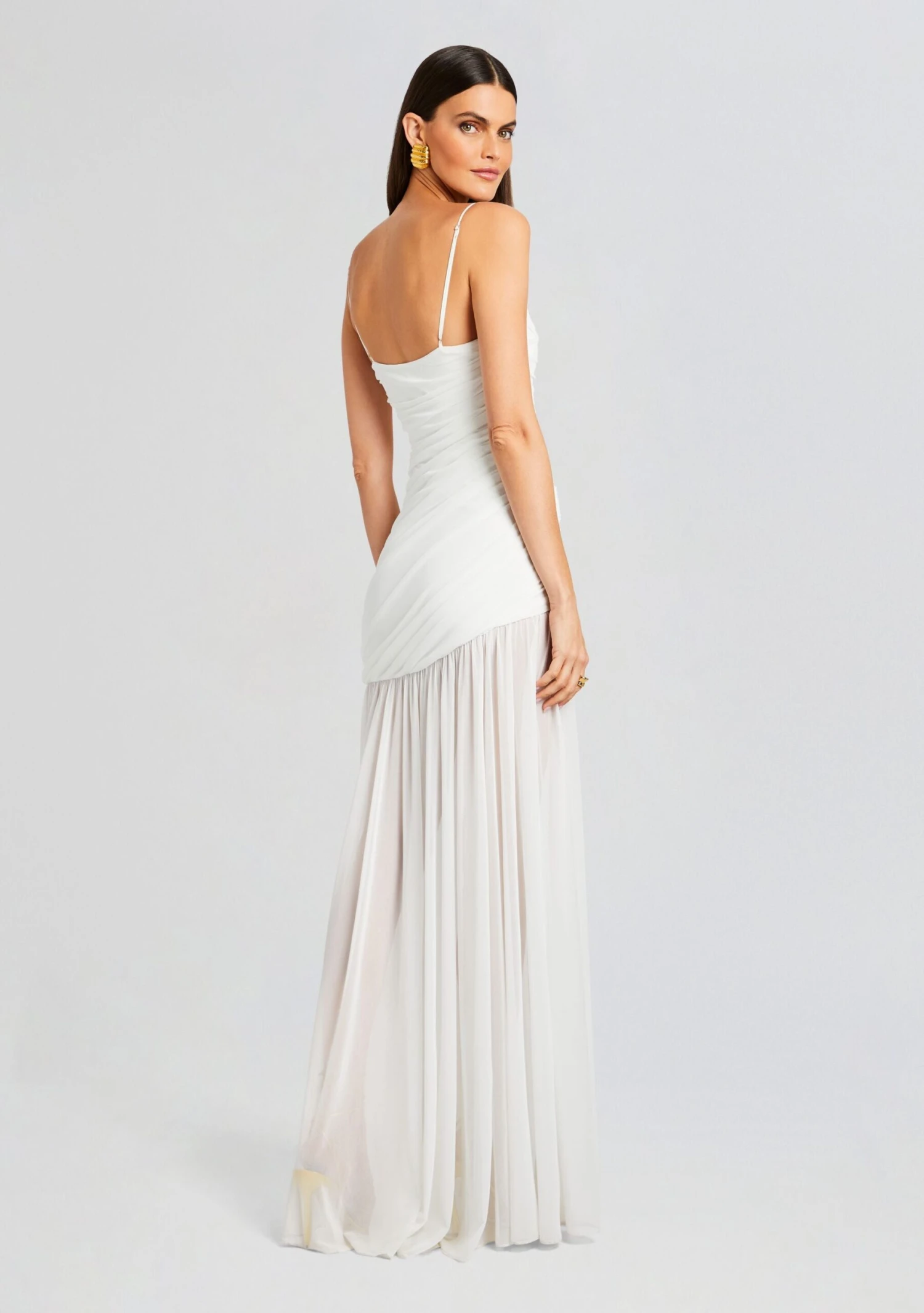 Experience glamour and grace in our Alessia Dress. Designed to hug your curves in all the right places, the body-con fit of this dress ensures you feel confident and glamorous and its figure-flattering silhouette exudes timeless elegance. The sheer hem adds a touch of ethereal beauty, delicately enhancing the silhouette and creating an enchanting and romantic look. Whether it’s your rehearsal dinner or an intimate gathering, this dress ensures you radiate charm and poise. Shown here in White.