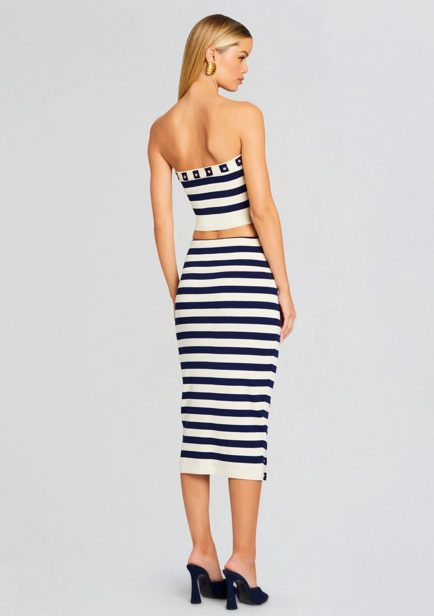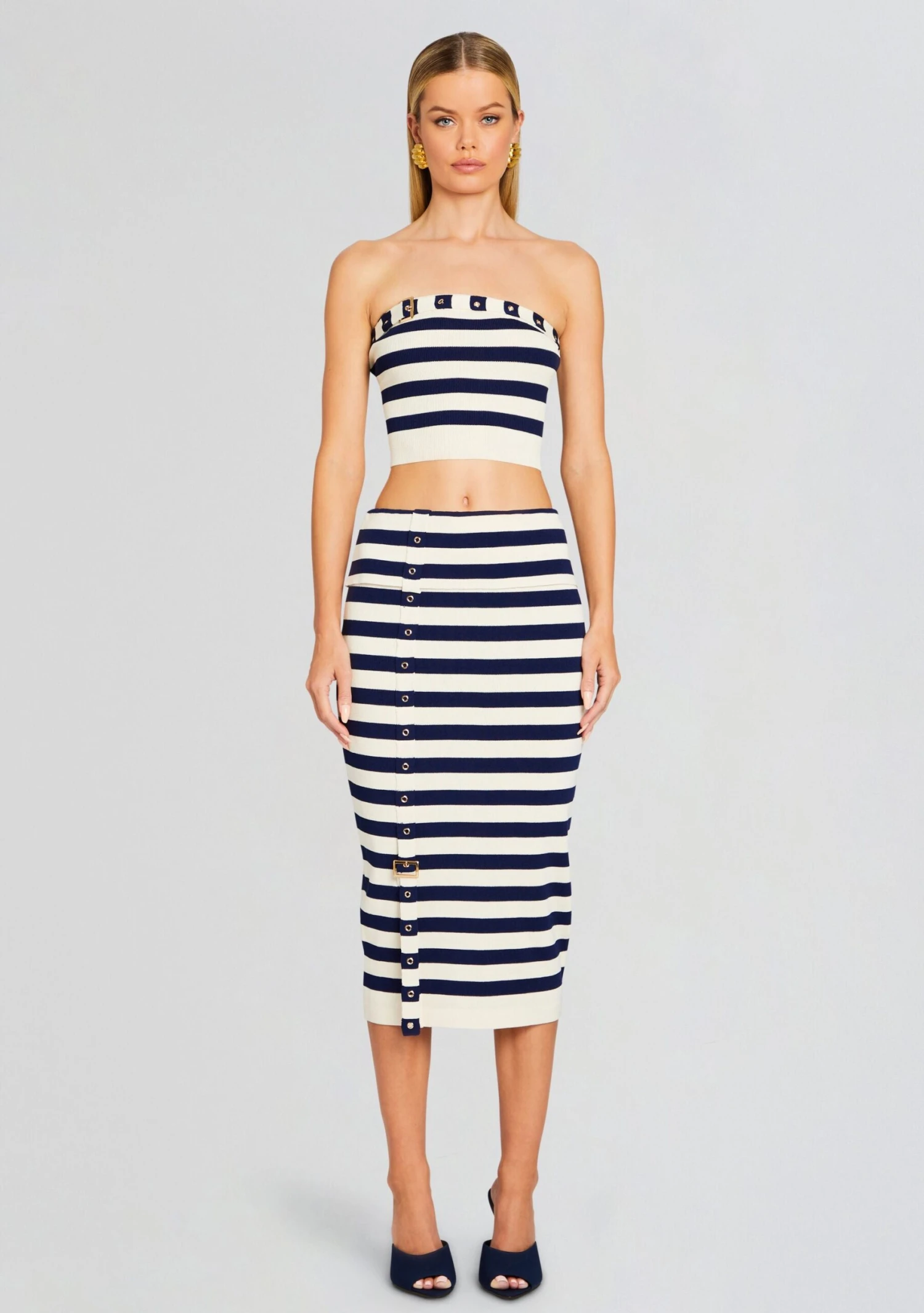 Don’t miss out on SER.O.YA’s elevated Cleat Skirt. This knit midi skirt is the epitome of style and sophistication, featuring a sleek bodycon fit, chic striped design and a fold-over waist with belt detailing. Pair with the Constance Top. Shown here in Cream/Navy.