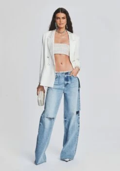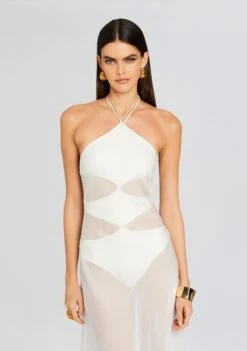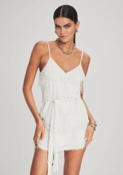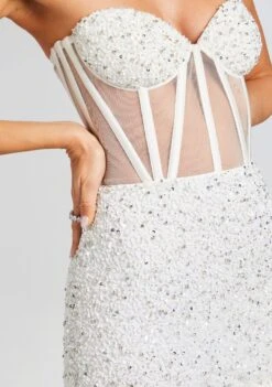 Our Deja Bra is a must. This double-clasped bra features crystal adornments lining the silhouette. Shown here in White/Gold.