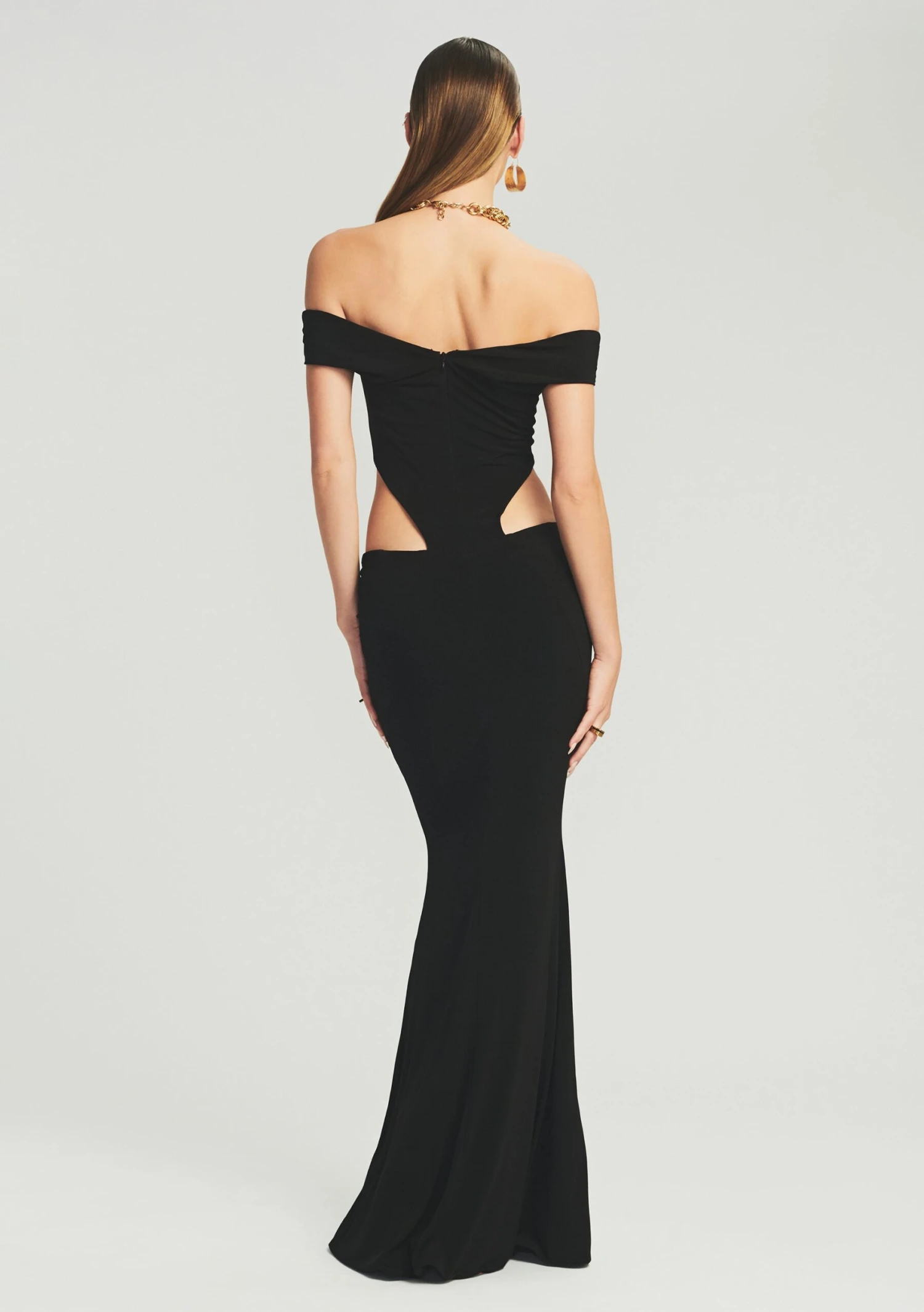 Own the room in our Giada Dress. This off-the-shoulder maxi is cut in a body hugging cupro, with daring hip cut-outs and a paneled skirt. A mock corset bodice features ruching at the cup, while a form fitting skirt leads to a dramatic flare. Shown here in Black.