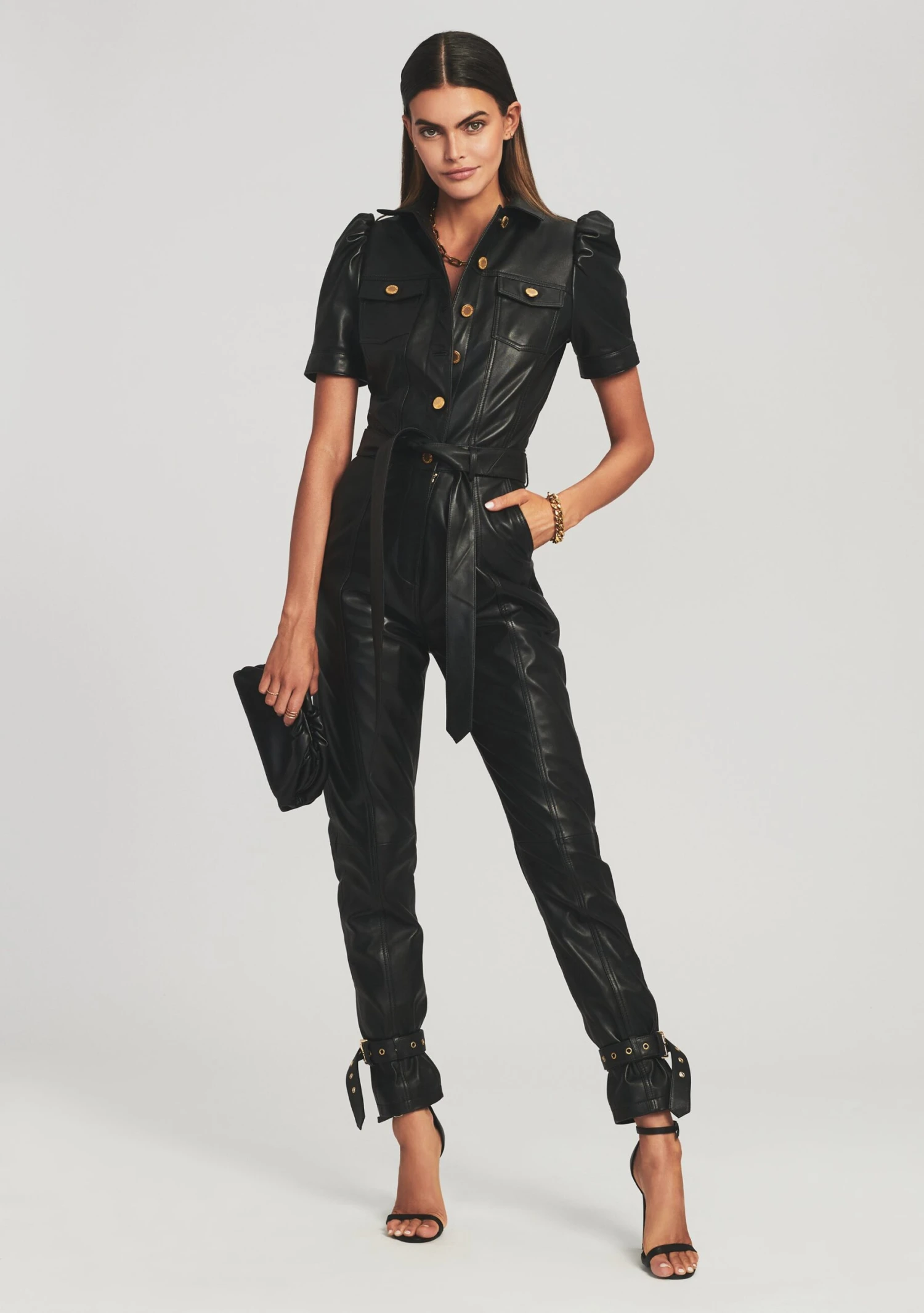 Edgy and fashion-forward, the Knox Jumpsuit will instantly elevate your winter wardrobe. Crafted in supple genuine leather, the luxe design is accented with puffed sleeves, tapered legs, and a collar accent. Shown here in Black.