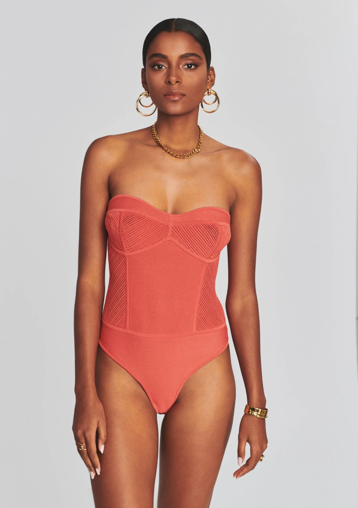 Our Lena Bodysuit is a warm-weather staple, perfect for showing off sun kissed shoulders. This strapless knit features artful seaming that creates the illusion of boning seen in traditional corsets. Easily dressed up or down, it can be paired with your favorite denim shorts or an elevated trouser. Shown here in Calypso Coral.