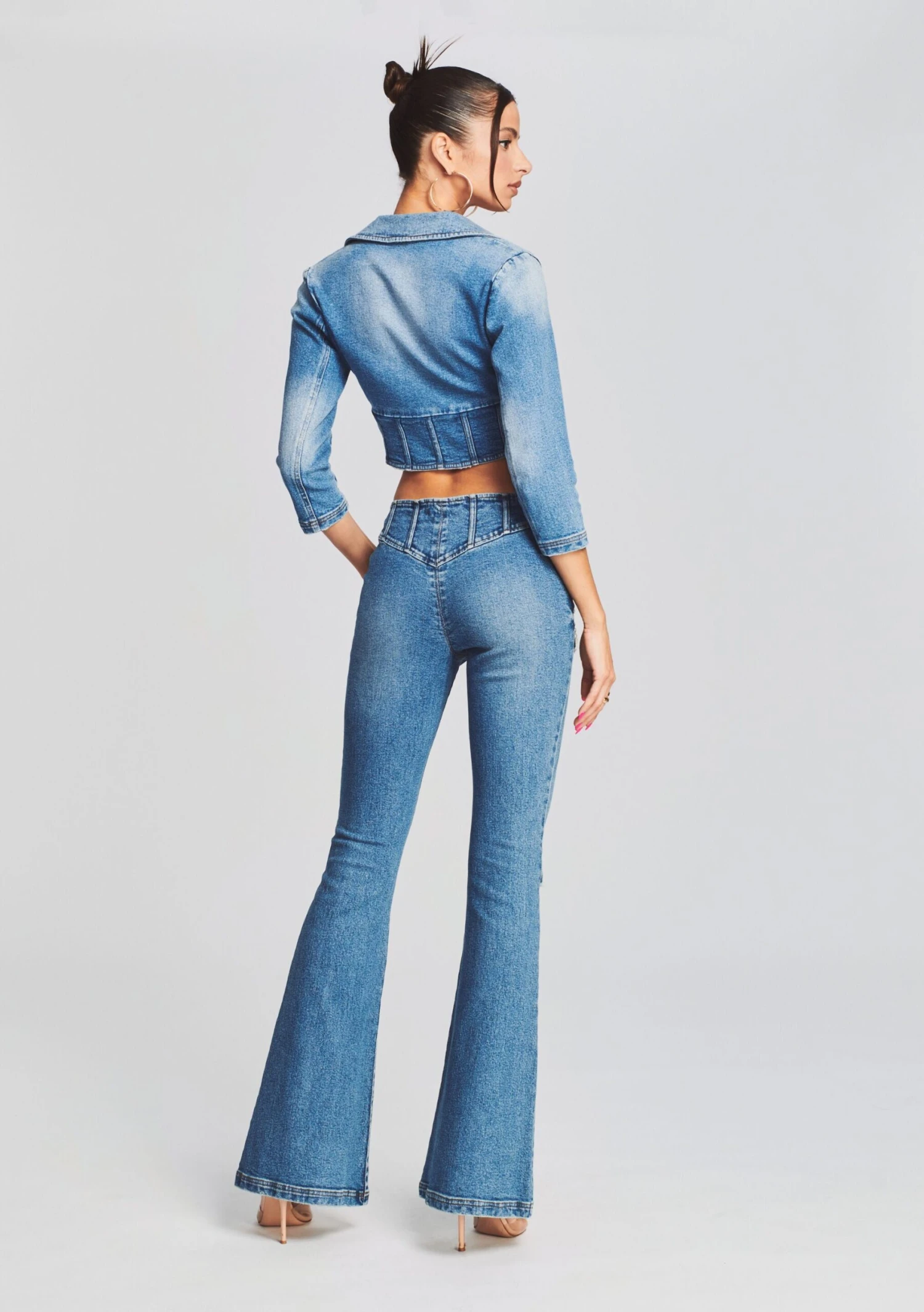 Our Maxine Denim Top is a redux on the classic denim jacket. This version features a shrunken fit, exaggerated collar, and corset-like detail at the cropped waist. It’s complete with a plunging neckline and exposed zip closure. Shown here in Bailey.