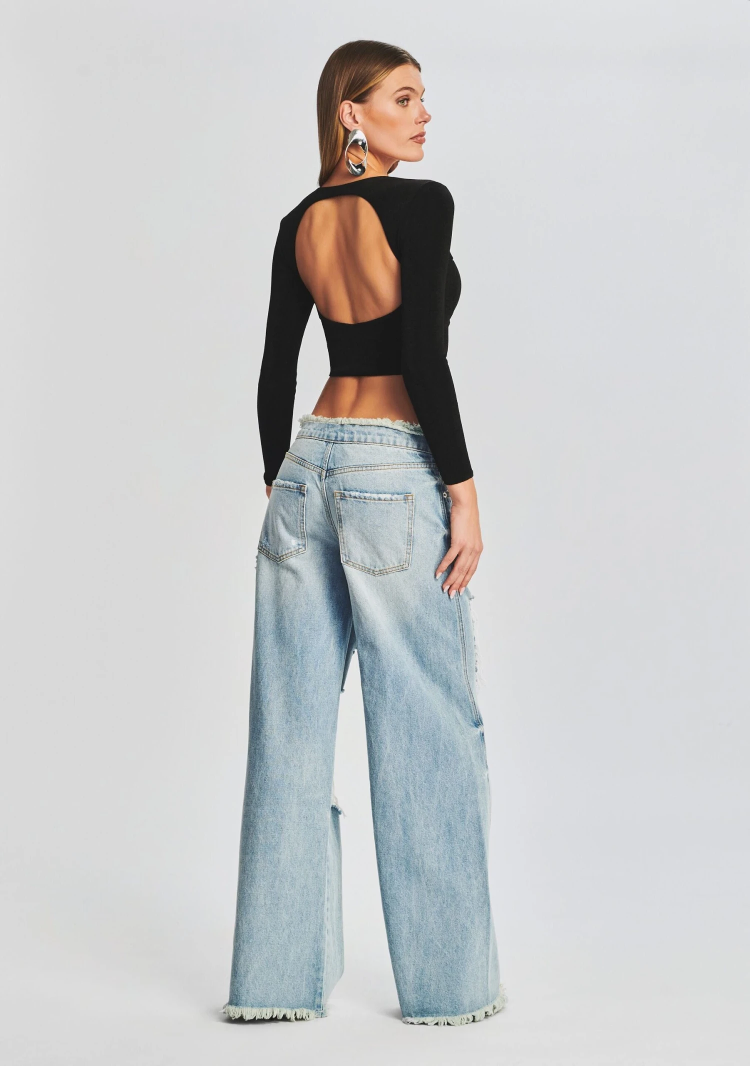 The Quincey Long Sleeve by SER.O.YA is a long-sleeve top with square sweetheart neckline. Finished built-in padding for support and an open back. Shown here in Black.