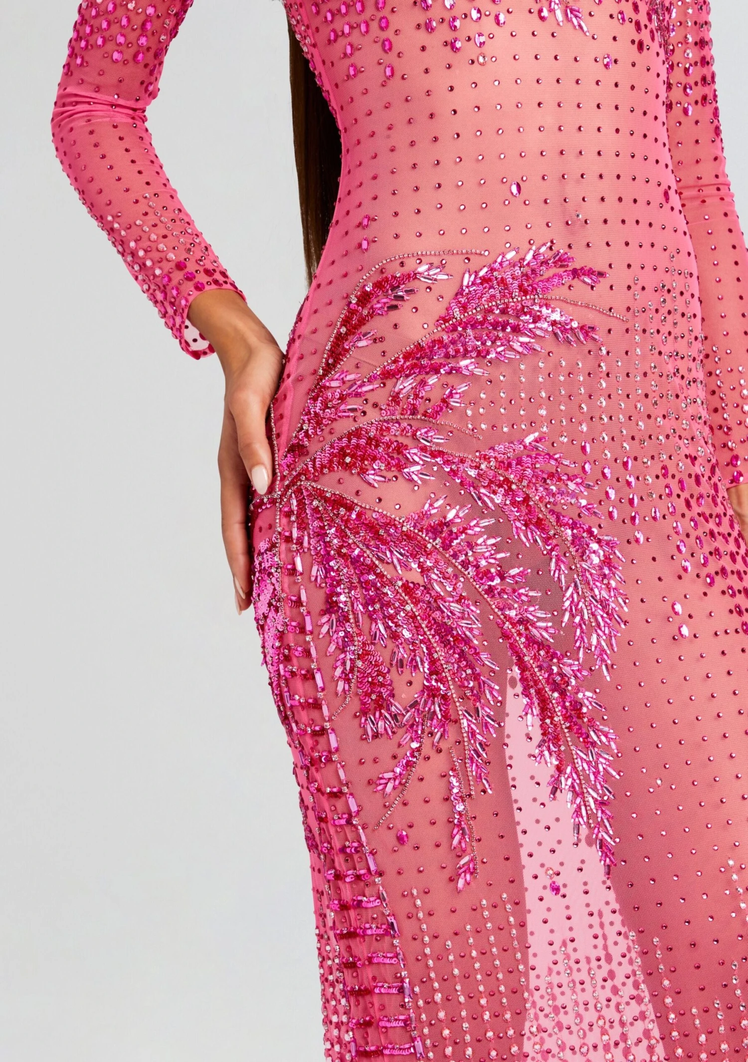 Embrace the extraordinary and make a statement in our Sammy Dress—an unmatched fusion of uniqueness and luxury.. The sheer elegance combined with the playful palm tree sequins offers a harmonious blend of chic and glamour that’s perfect for those seeking a distinct style. Step into the limelight and be the center of attention at any event, from glamorous soirées to exotic getaways. Shown here in Ultra Pink.