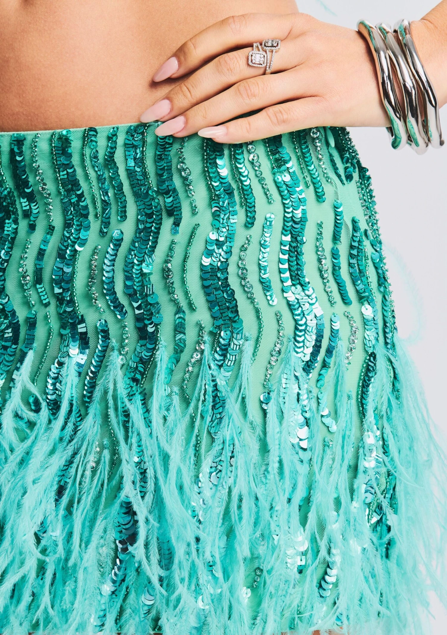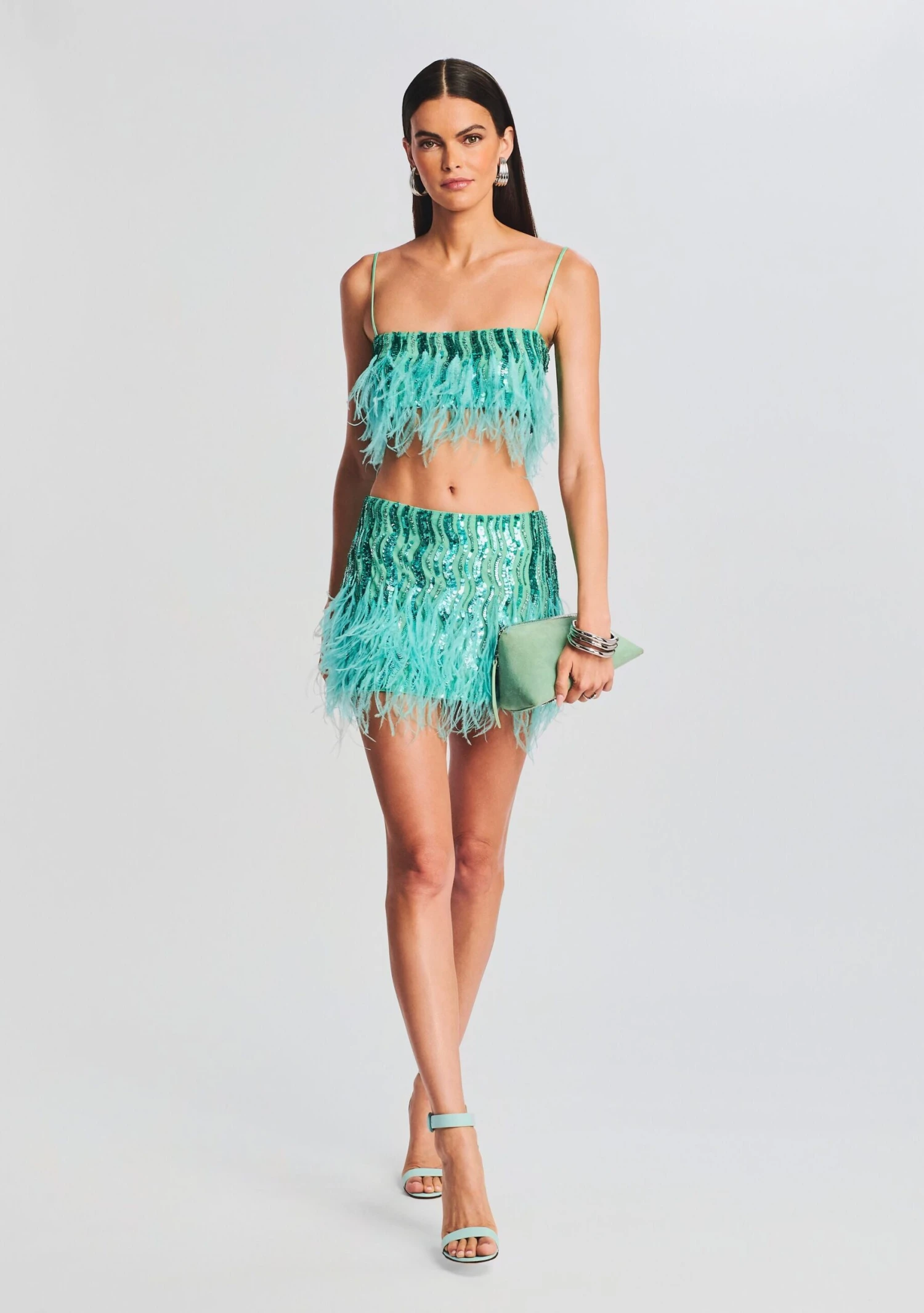 Take fringed dressing to new heights in our Tai Feather Skirt. This handcrafted mini style features a sea-inspired sequin design and a feathery trim for added flair. Match your look with our Ondina Feather Top to create a monochromatic style moment. Shown here in Sea Foam.