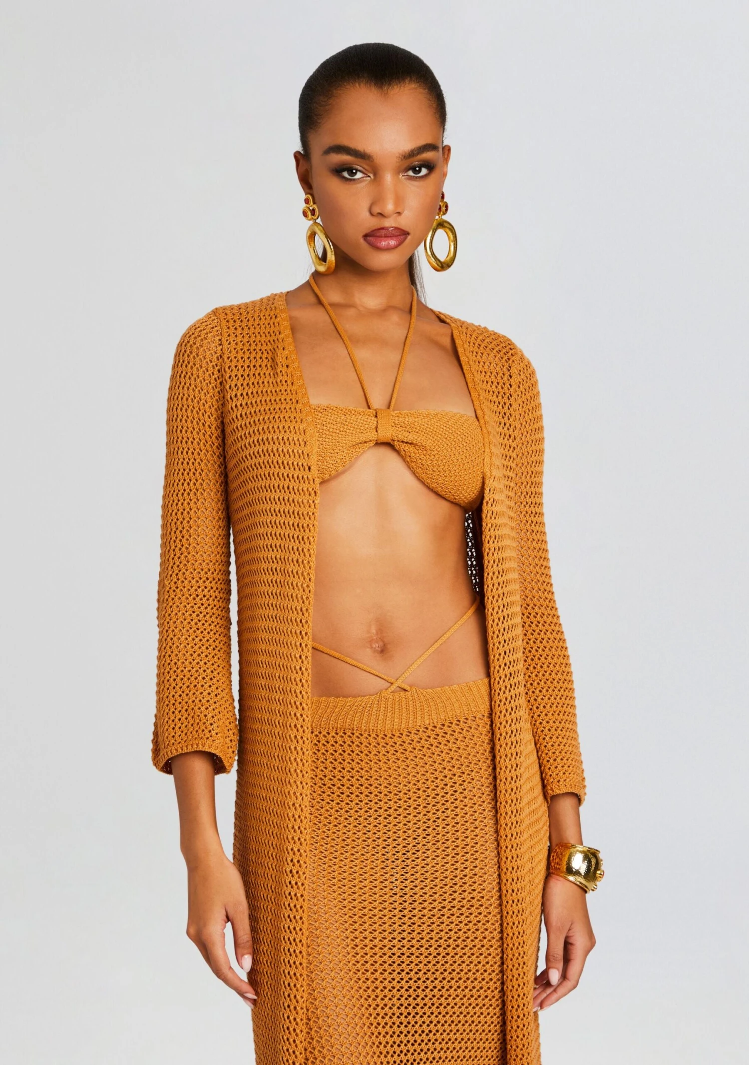 Effortlessly move from sun-kissed days to lively evenings with Bananhot’s Viola Cover Up—an essential piece that effortlessly transitions from serene beach vibes to sophisticated bar settings during your vacation getaways. Its floor-length design and long sleeves provide a graceful silhouette, ideal for beachside lounging or layering up for an evening soiree. Shown here in Tobacco.
